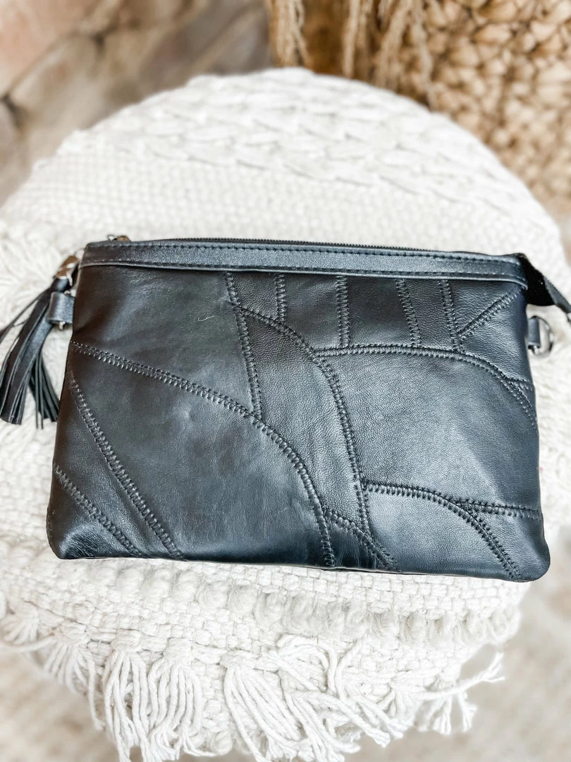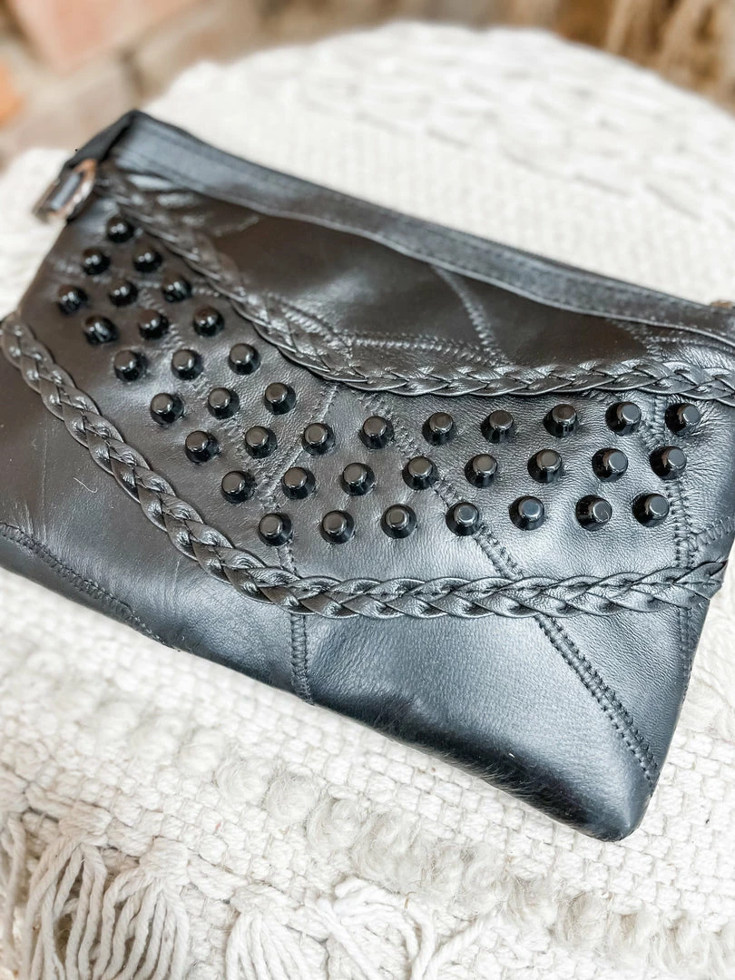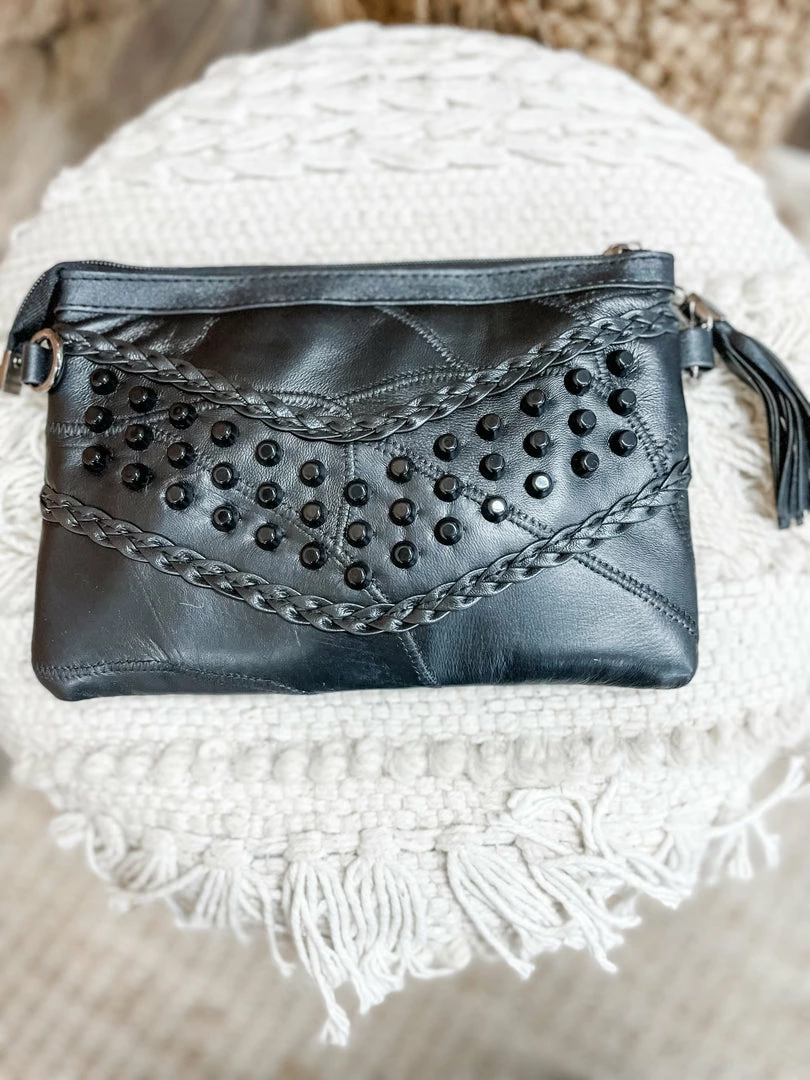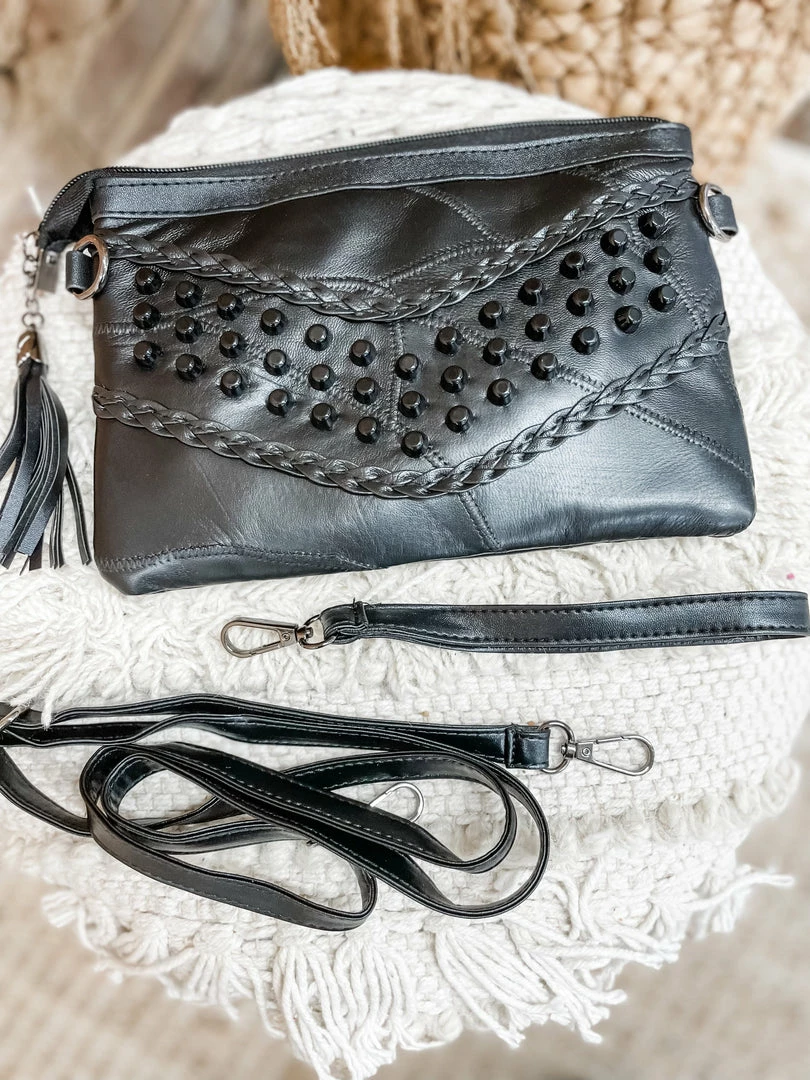 Buy ! The ! Bag ! This sweet accessory has a top zipper opening with tassel detail. Equipped with a removable crossbody strap and wristlet. Finishing with fun stud details for a chic edgy look! Tell the hubby, tell your gals, this is the bag you need!