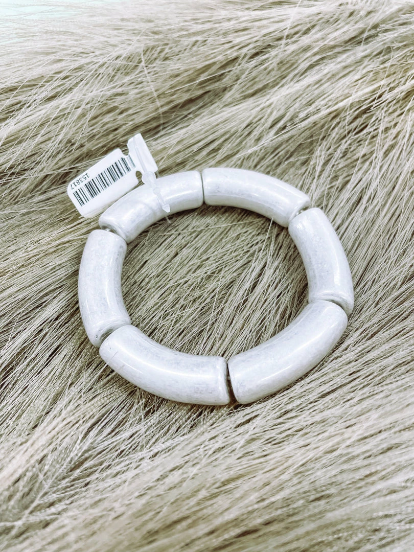 This silver acrylic bracelet showcases a neutral accessory with a touch of shimmer! A new everyday bracelet that will enhance every outfit!