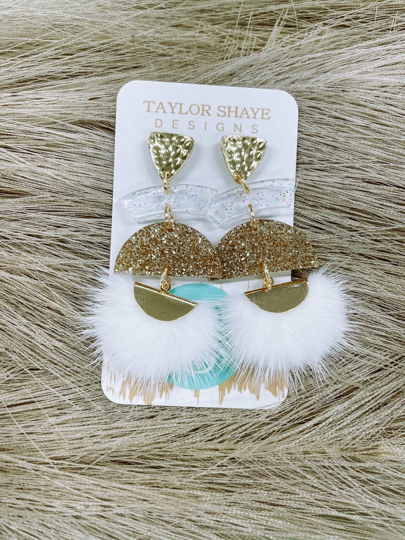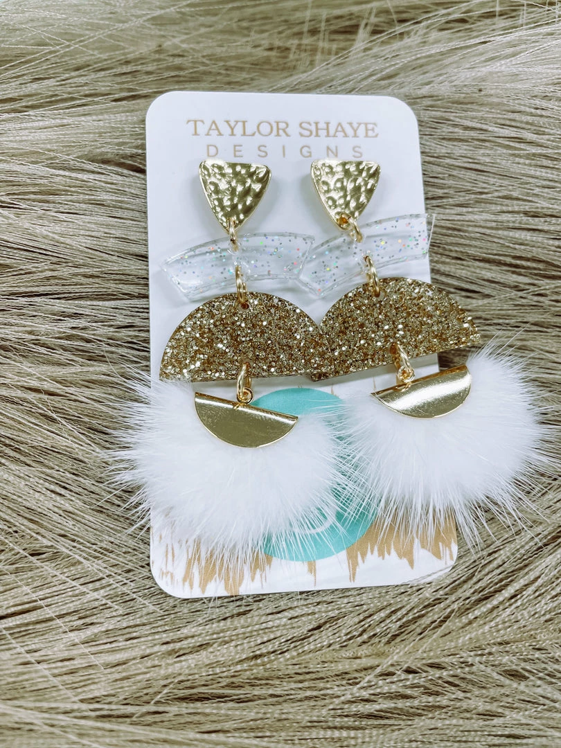 Girl, you are flawless! 😉 The Wren earrings are the absolute cutest with a white puff pom, gold, clear, and glitter inspired details!