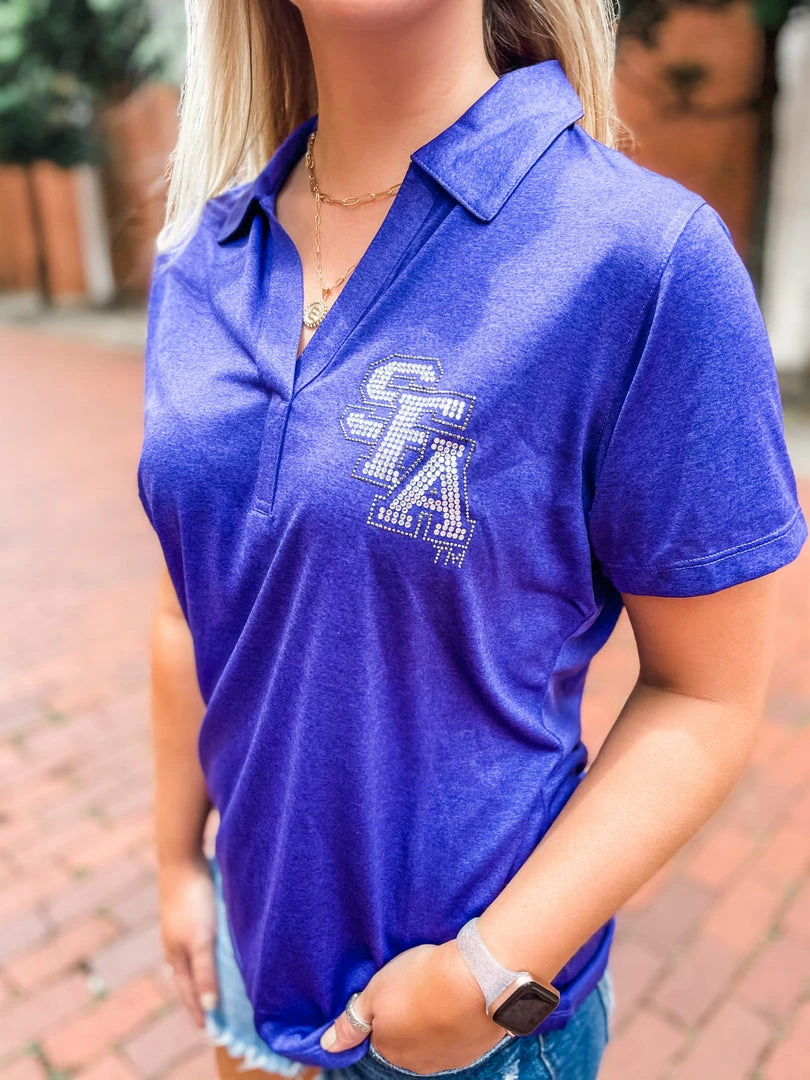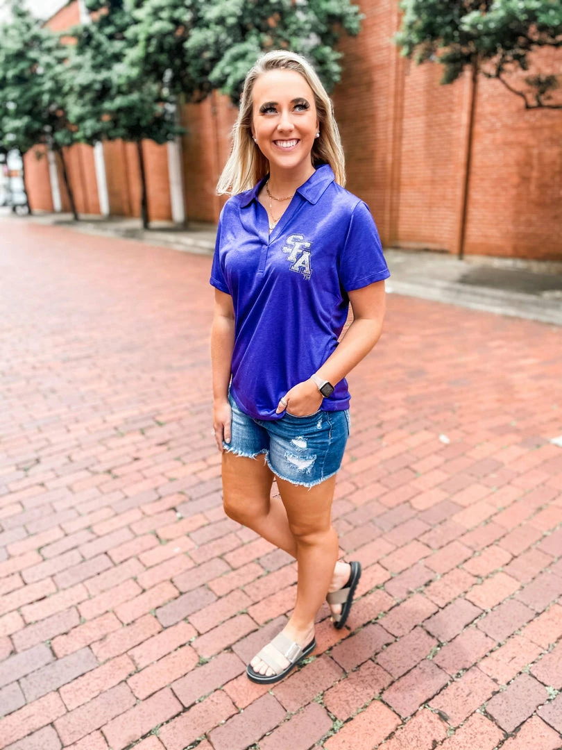 Super Soft and cute but professional SFA Ladies Polo! This shirt is made of 100% Poly and has a super silky feel to it. Topped off with SFA bling on the front and you are ready for business or personal events! LST660