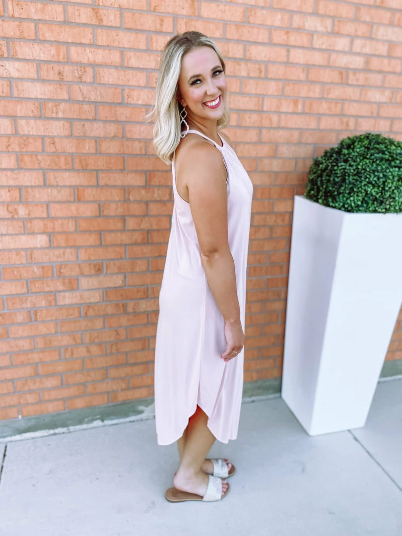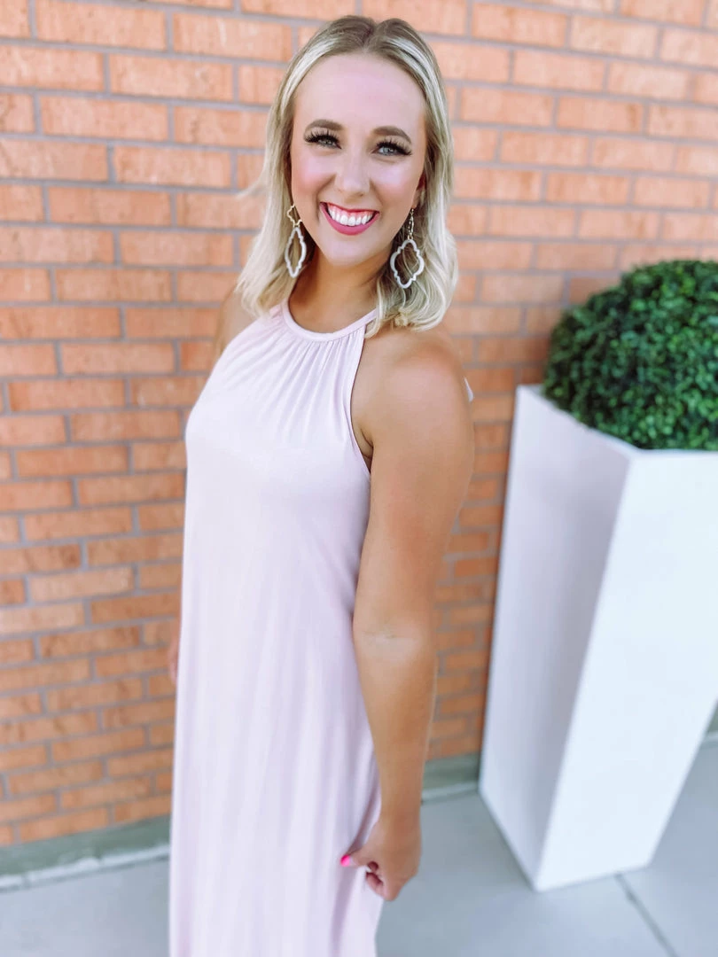 Meet the summer approved Jayla Dress! Tailored with a halter neck line + pleated detail + keyhole feature + side slits. This cuite dress is so light weight and breathable for all of your summer outings! Easily dress this up or keep it casual! Styled with the Skylar One Band Sandals + the Lovie Earrings.