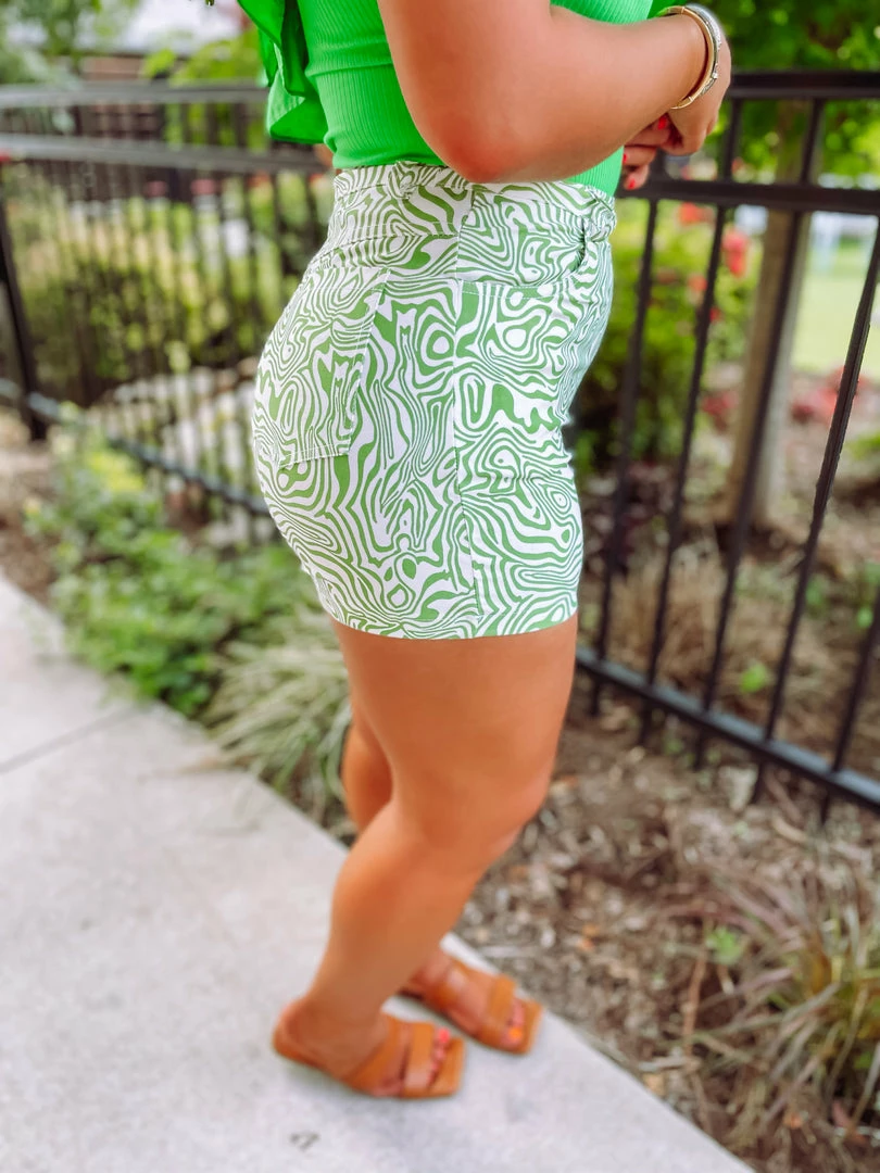 We will be wearing the Julianna Shorts on repeat this summer! What about you? Tailored as high waisted + button/zipper fly + belt loops + 4 pocket design + a green abstract pattern. These light weight shorts are perfect for the summer heat! Not to mention the cutie design is the best way to elevate your wardrobe! Steal Morg’s style and pair these with the Preslie One Shoulder Bodysuit + the Ramsey Sandals.