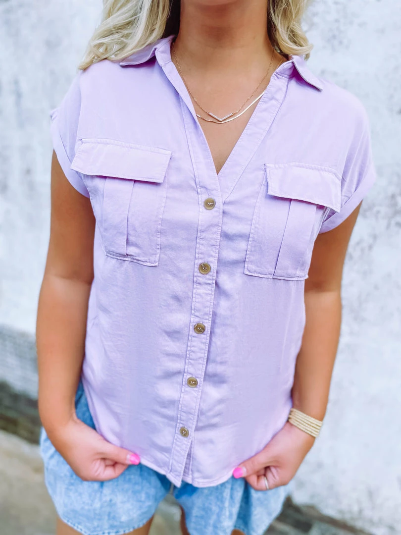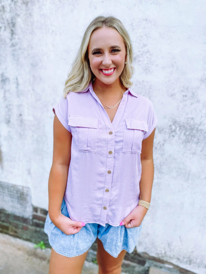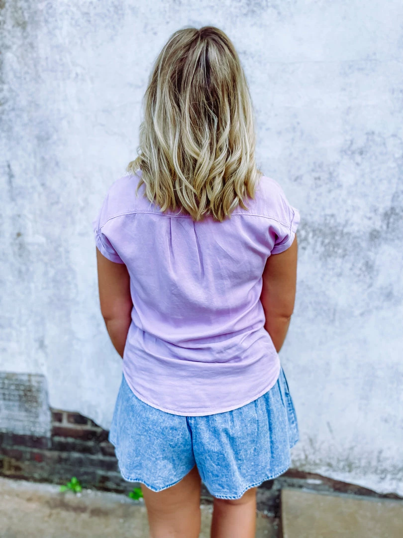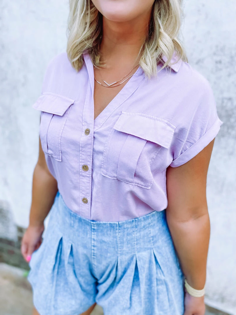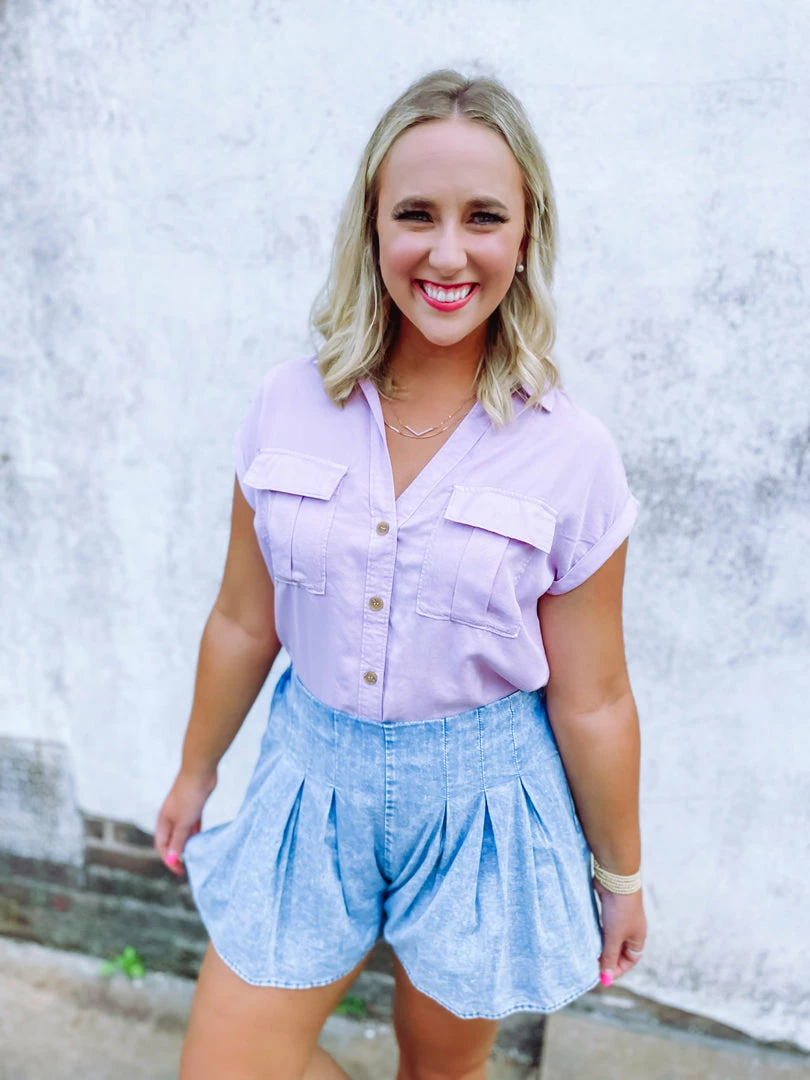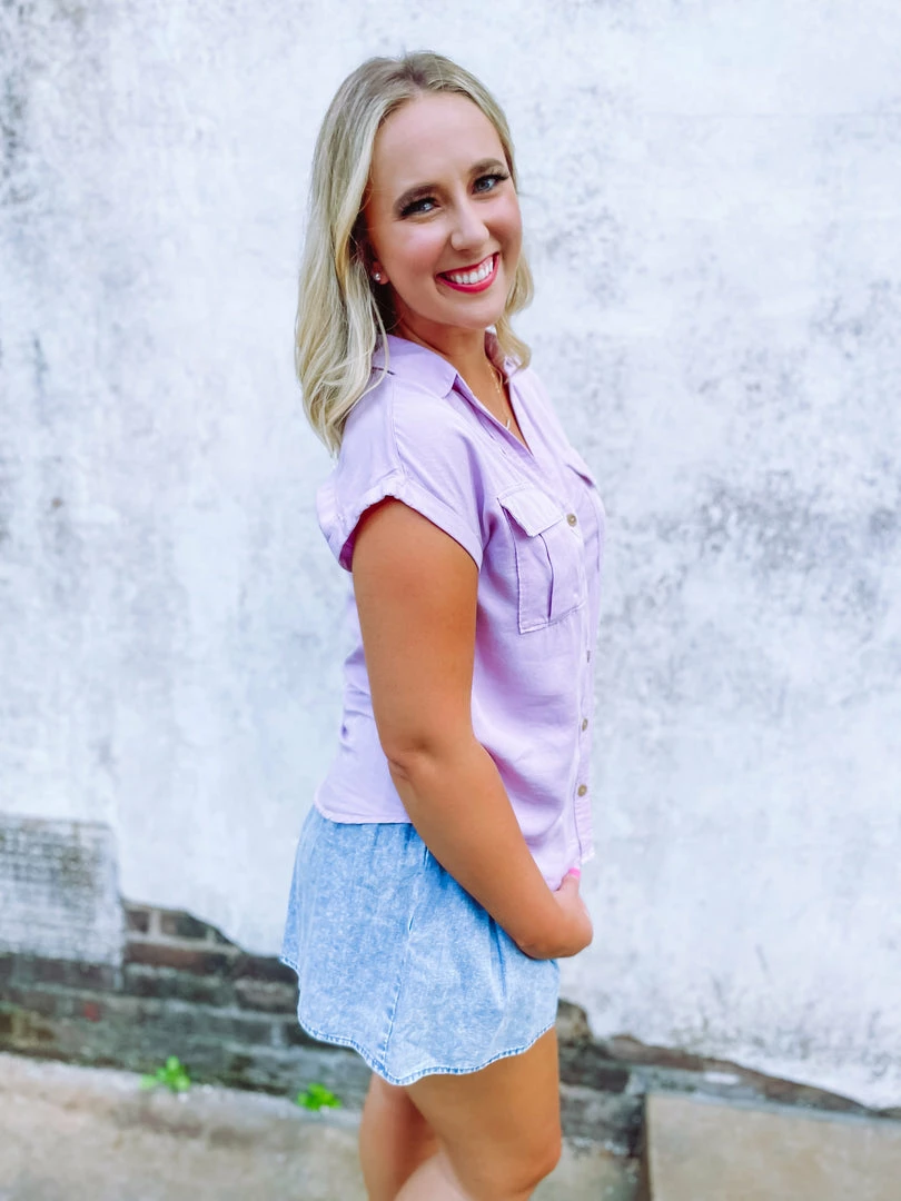 A top like this always guarantees a good time! The Sydney Top is designed with a v neck line with a collar + functional button down style + 2 front pockets. This cute lil number will elevate any summer look! Wear it unbuttoned over your favorite brami, or style it like Shelby! Perfectly paired with the Phoebe Denim Skort.