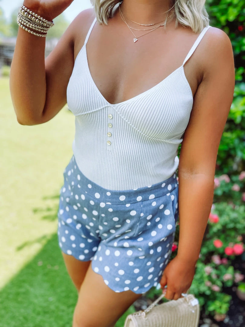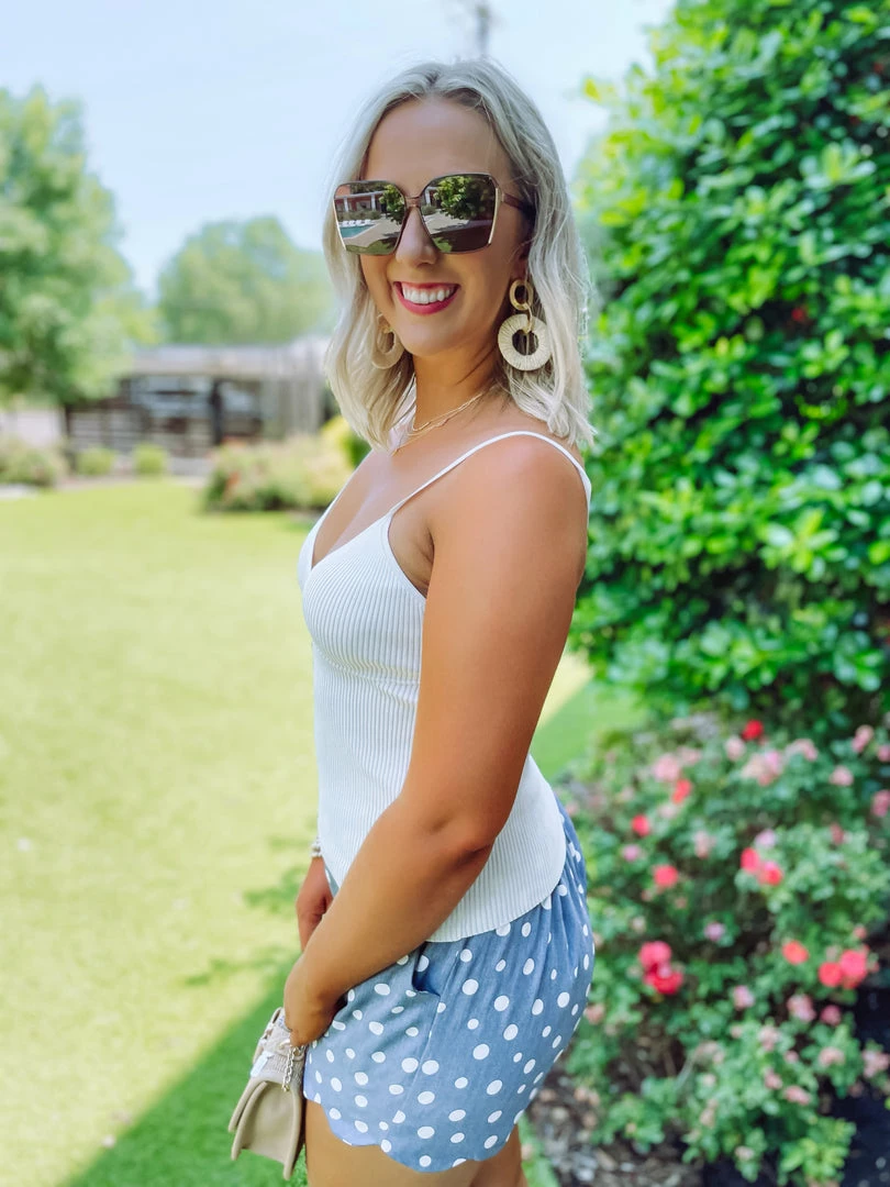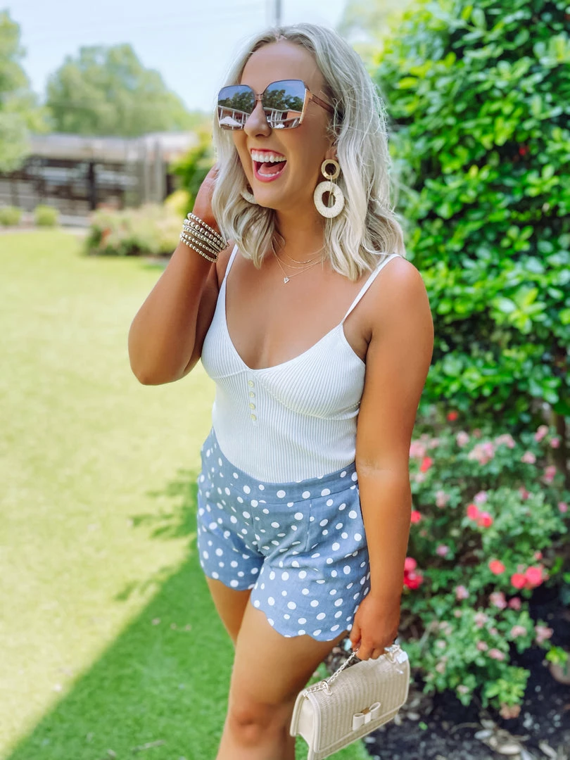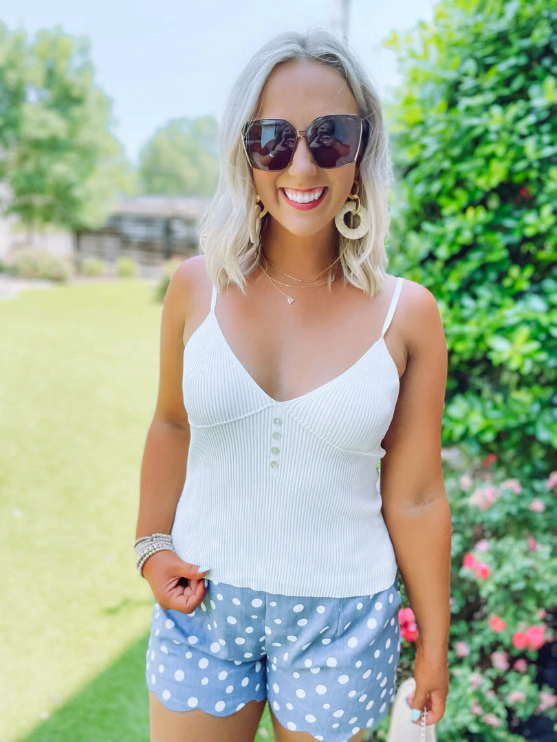 Live in the sunshine with our Kora Cami Top! This chic top is the essence of summer! Featuring a sweetheart neckline, button details & straight hem! This is the top you want in your suitcase for vacay! Easily dolled up and great layering basic! ~ Perfectly paired with our Shelby Sunglasses, Lillith Polka Dot Scallop Shorts, Adler Wedges and Hallie Rectangle Straw Bag.