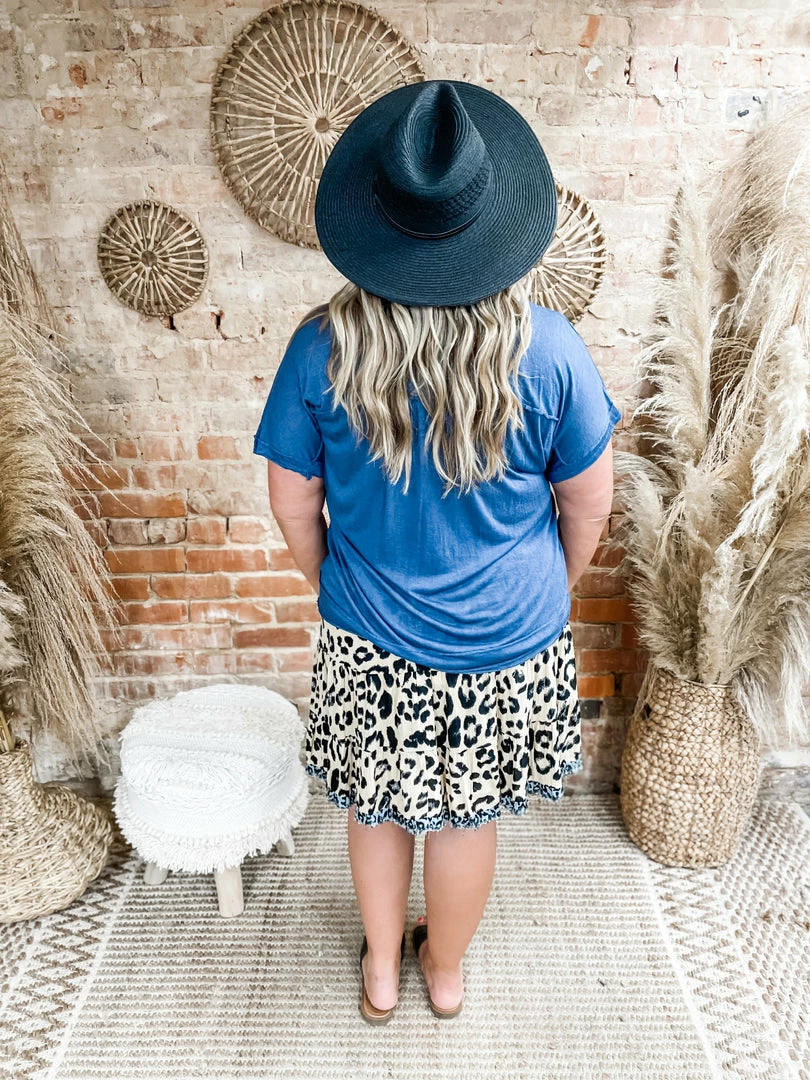 Hey fashionista girl! We’ve got the right top for you! Our Hannah Raw Edge Button Detail Top is giving off major versatile vibes! Tailored with a curved neckline + short sleeves + button detail + beautiful blue! The fabrication is so lush! Finishing with raw edges throughout! Steal Lesly’s Style! ~ Perfectly paired with our Austin Woven Leather Panama Hat, Heidi Sandals and Tiffani Leopard Ruffle Skirt.