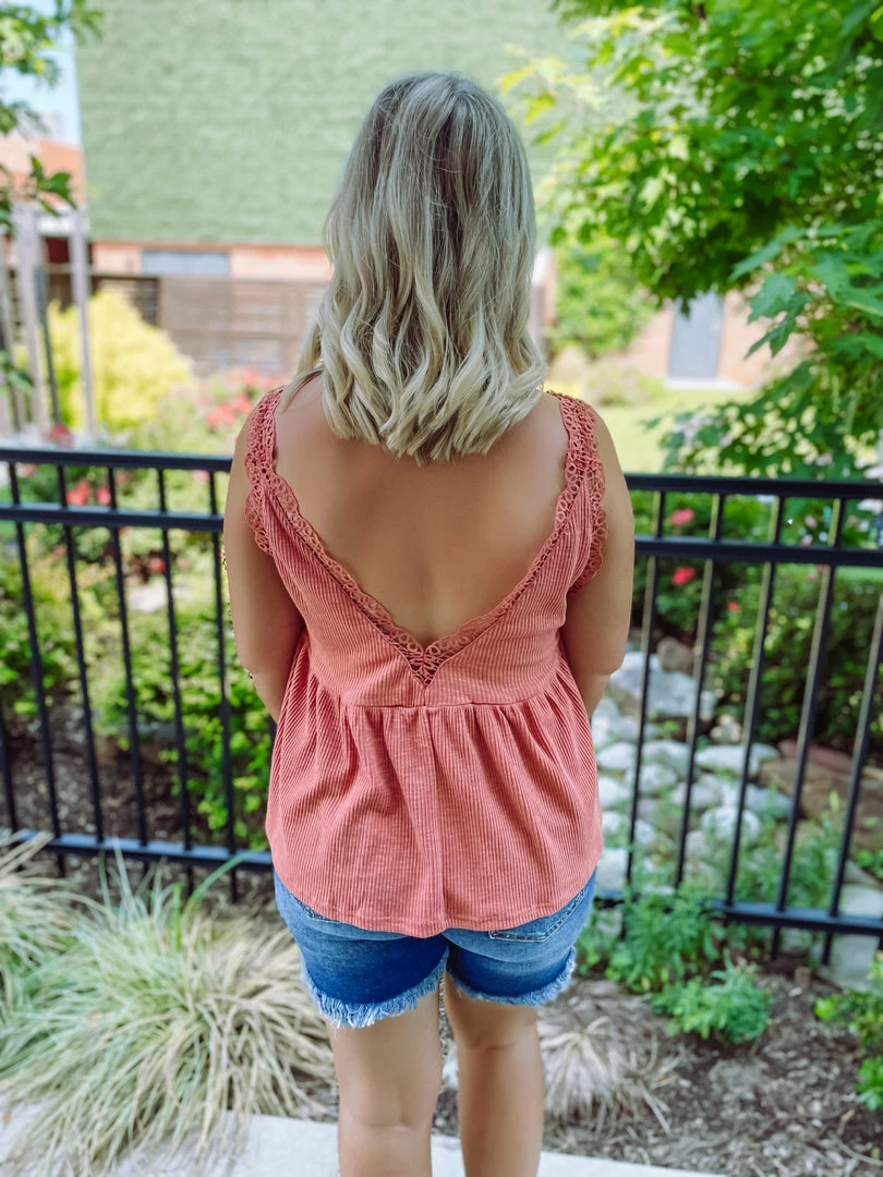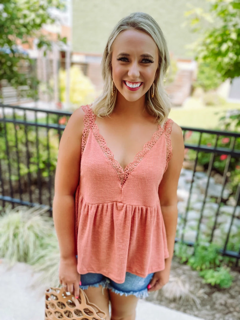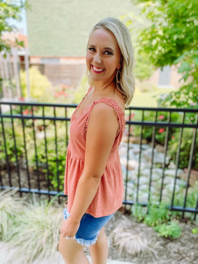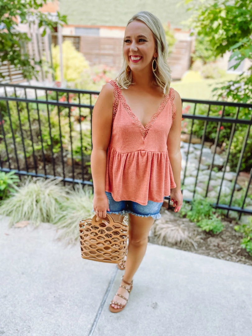 An easy going top is the best top! The Callie Top is tailored with a v neck line + crochet detailing + ribbed material. This tank is perfect for these HOT summer days! Just throw on and go! Styled with the Vanessa High Low Shorts + Maya Sandals + Lucky Earrings + the Lila Summer Handbag.