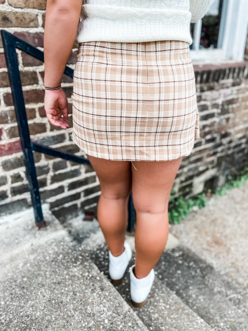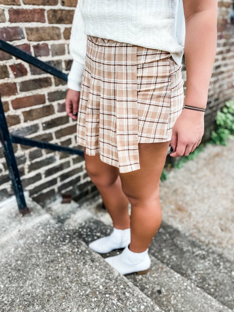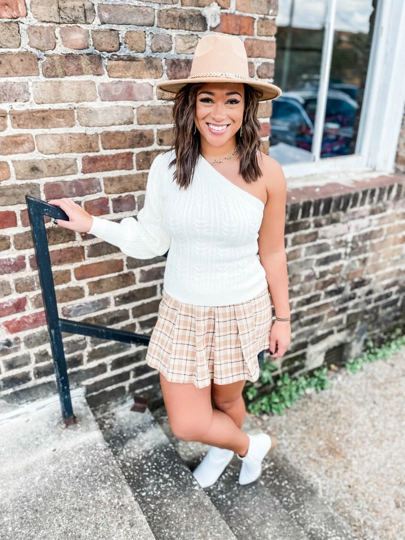 The Julia Plaid Pleated Skirt takes every day wear to a new level of chic! Tailored as high waisted, pleated, and a back zipper! Everything a girl needs for ultimate comfort all day long while looking fab! We love this skirt styled with an oversized sweater or graphic tee! Styled with our Norway Booties, Aliza Tone on Tone Felt Hat and Vivian Asymmetric One Shoulder Sweater.