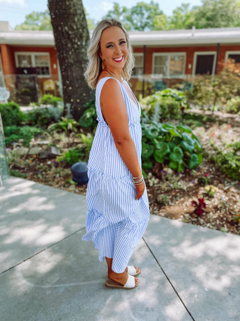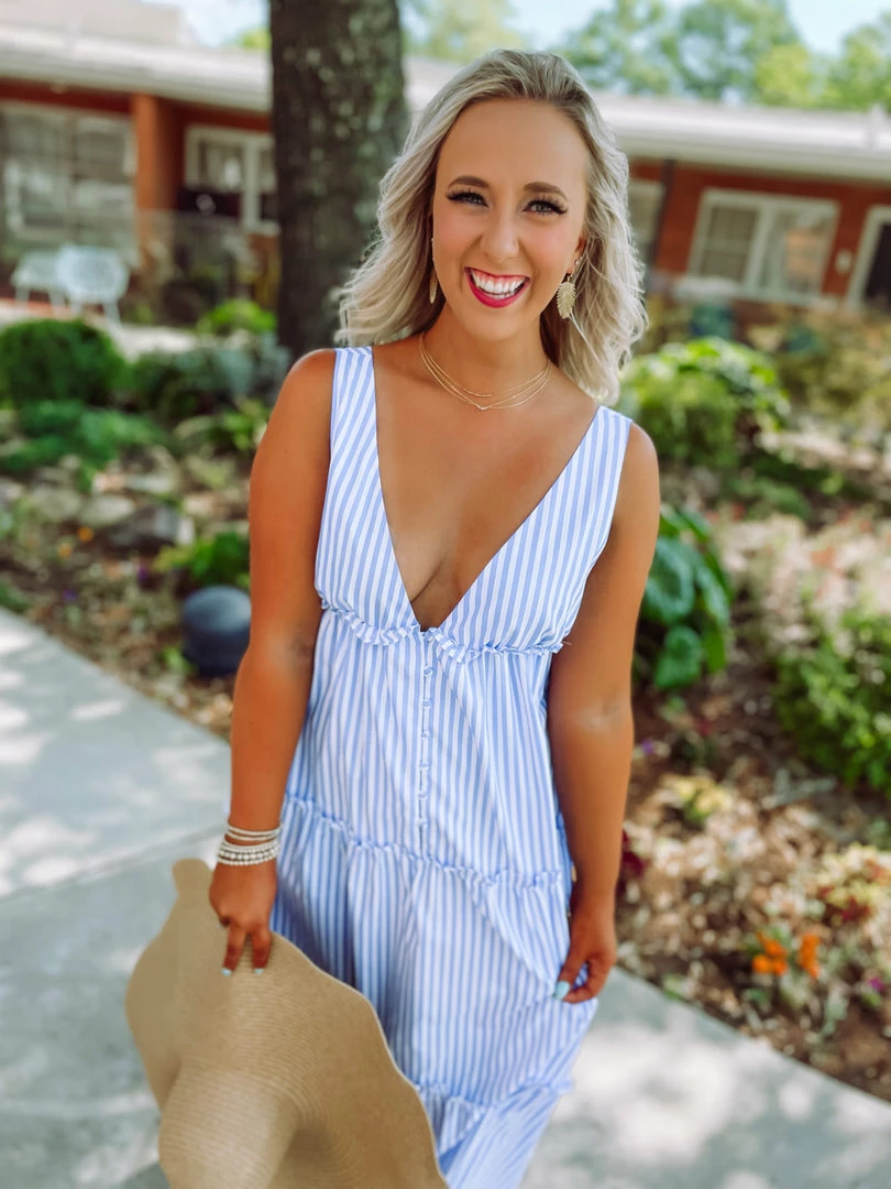 Stay breezy and cute in our newest maxi dress! It’s no secret this dress is perfect for every summer event! Featuring a v neckline + tank fit + straight hem + ruffle & button details! Yeah yeah girl! Snag this one ASAP! Be flawless all day long! Styled with our Everly Beach Sun Shade Straw Hat & Efron Sandals.