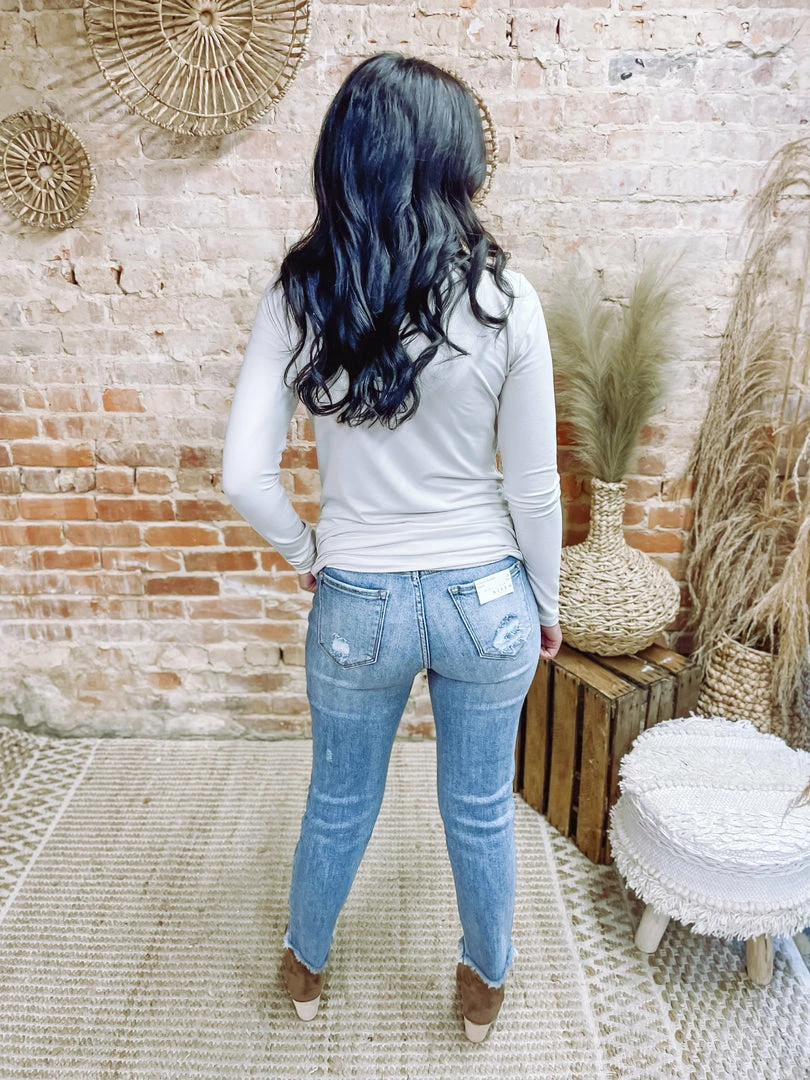 Our Rylee Top is one that you will truly fall in love with! Obsession is an understatement! Featuring a mock neck + long sleeves + buttery soft material + great length! This basic top will keep you care free, casual, & comfy! We love the look it brings! Perfectly paired with our Colette Wide Straight Leg Jeans and Leo Booties.